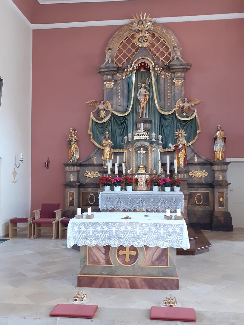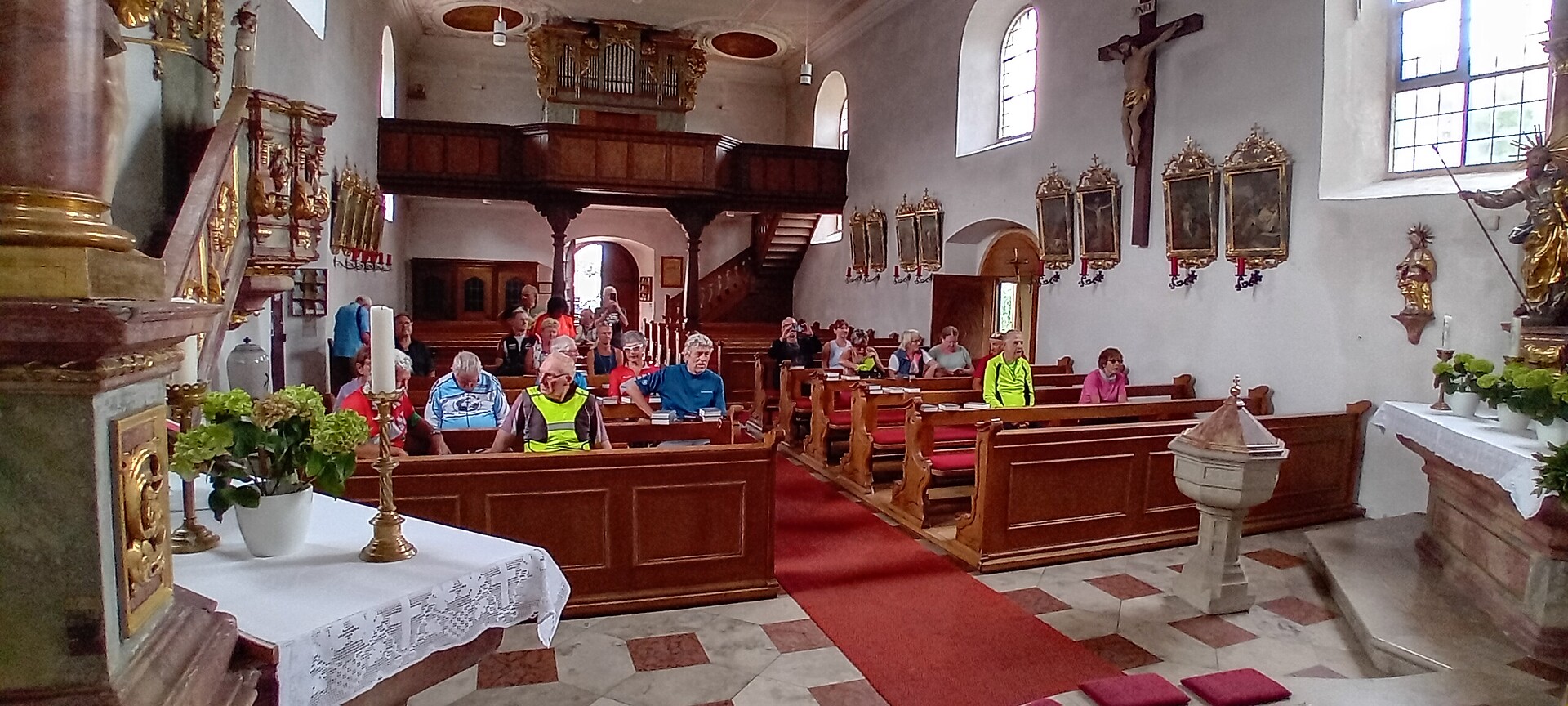 Nach dem reichhaltigen Mittagsbuffet, das Sr. Carolina und Frau Reuß vorbereitet hatten, radelte die Gruppe weiter zur nächsten Station am Gügel. Danach war die Pilgergruppe zu Gast in der Abtei Kirchschletten. Äbtissin Mutter Mechthild begrüßte den Tross mit Informationen zum Kloster und zur Kirche. Anschließend war es auf genussvolle Weise möglich, die verloren gegangenen Kalorien im Pilgersaal bei einem reichhaltigen Kuchenbuffet wieder nachzufüllen. Nächste Station war die Hankirche bei Prächting, ebenfalls eine wunderschöne Kirche im "Gottesgarten". Schließlich radelte die Gruppe nach Nedensdorf zur letzten Kirchen-Station "Maria Königin". Nach einem wohltuenden Impuls von Kirchenpfleger Matthias Pospischil sang die Pilgergruppe zum Auszug das bekannte Kirchenlied "Großer Gott, wir loben dich" und kam nach der Schluss-Etappe wieder sicher und heil am Bahnhof in Bad Staffelstein an.