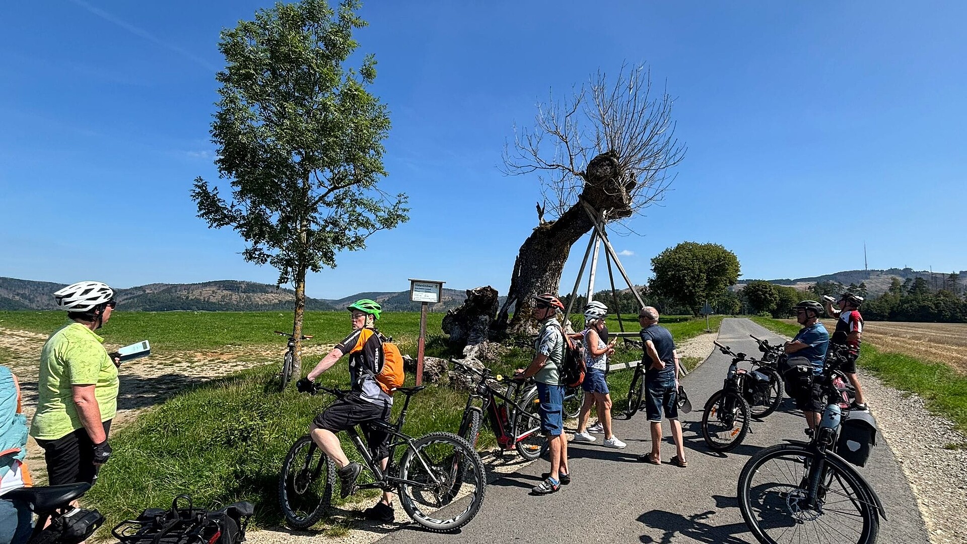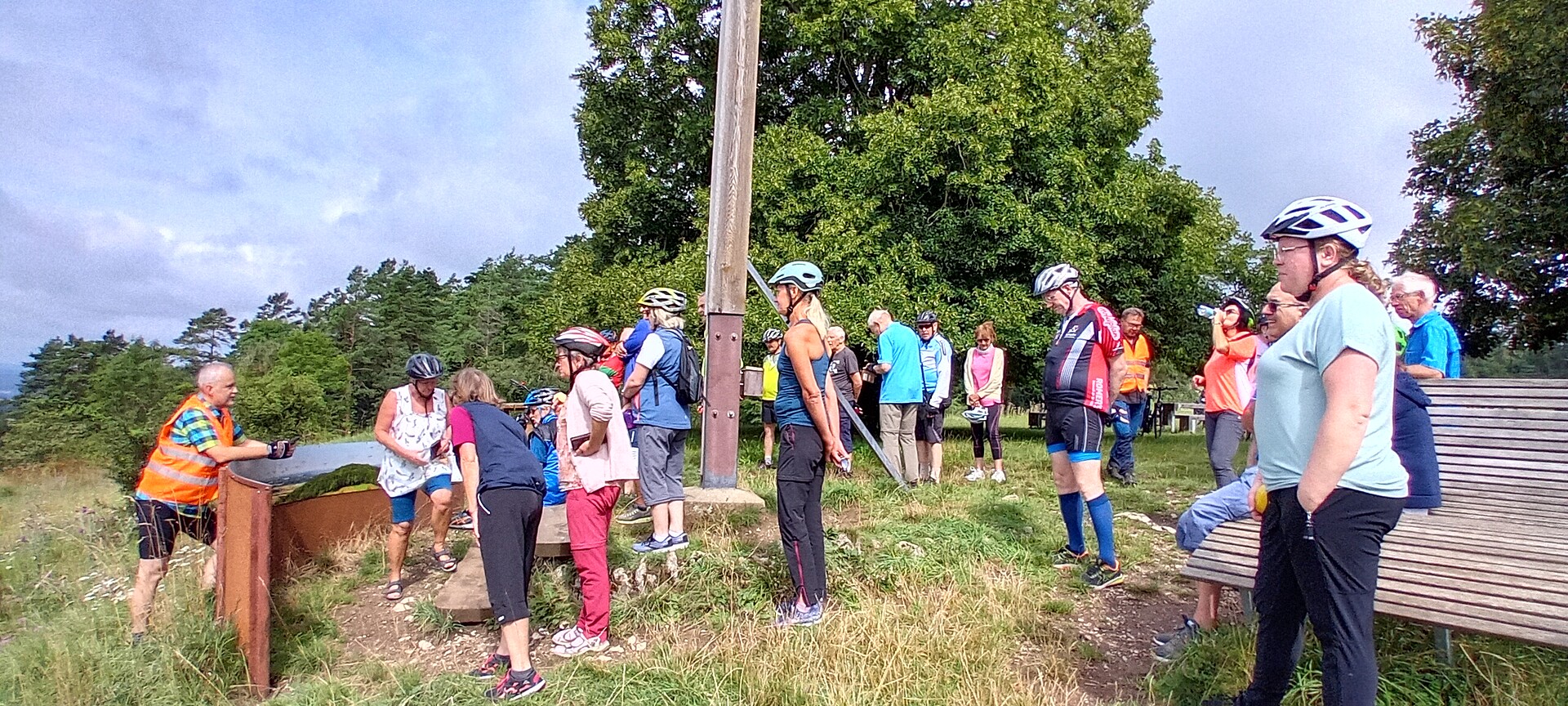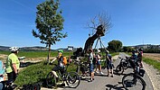 Diese Tour hatte ADFC-Tourenleiter Dr. Ralph Fischer vom ADFC-Obermain individuell zusammengestellt. Die Gäste waren zum Teil aus Unter- und Mittelfranken und aus der Region Hof angereist. Die Route startete am Bahnhof in Bad Staffelstein und führte zur ersten Station am Ansberg, besser bekannt als "Veitsberg". Dort befindet sich seit etwa 200 Jahren ein Rundhain aus 21 Linden, der als der älteste geschlossene Lindenkranz Europas gilt. Die Pilgergruppe wurde dort mit Kirchenläuten begrüßt und mit einer Hinführung zur Geschichte des Ortes und der Kirche informiert. Das Kirchenläuten und kurze Führungen fanden in ähnlicher Form auch an den späteren Kirchen-Stationen statt.